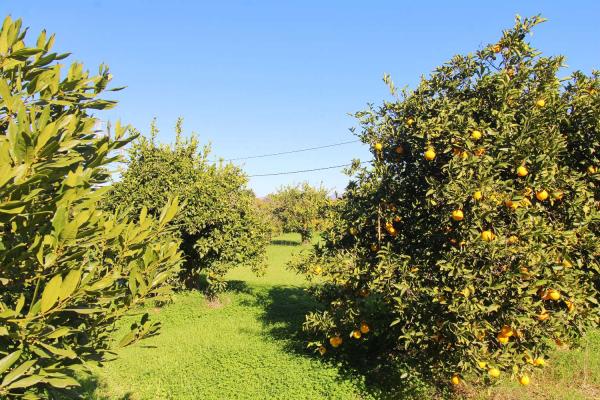 50 orange trees, 12 Muscat grapevines, 4 olive trees, 2 avocado trees, 1 persimmon tree, 1 quince tree, 3 almond trees, 1 fig tree, 2 bay trees, 2 mandarin trees, 2 lemon trees, and 1 cherimoya tree.