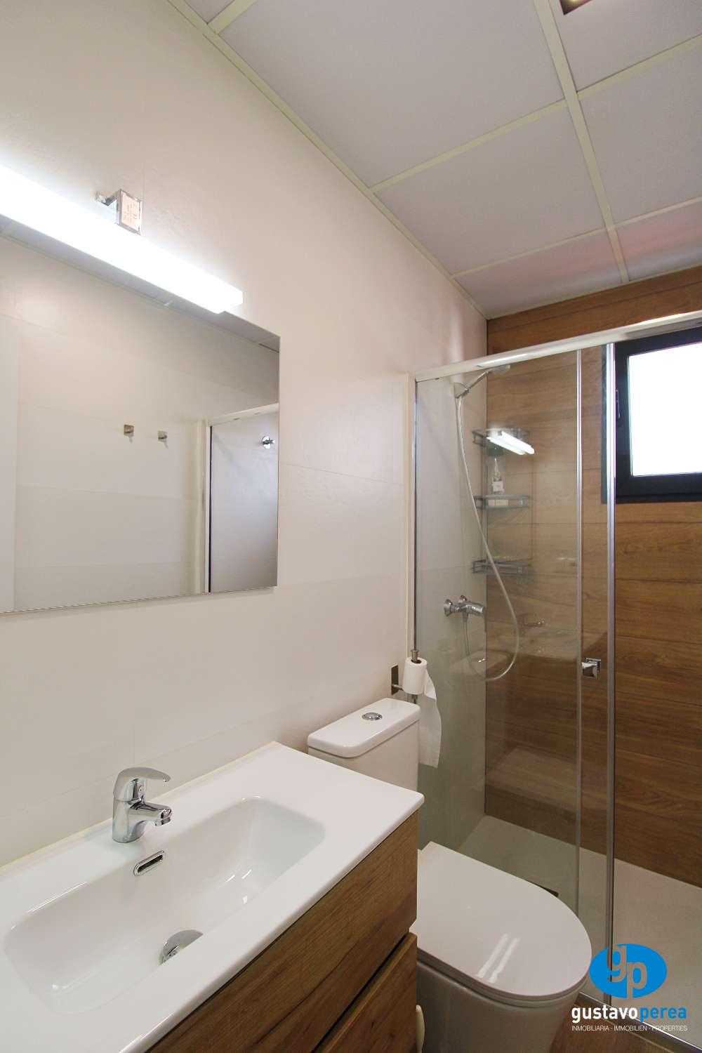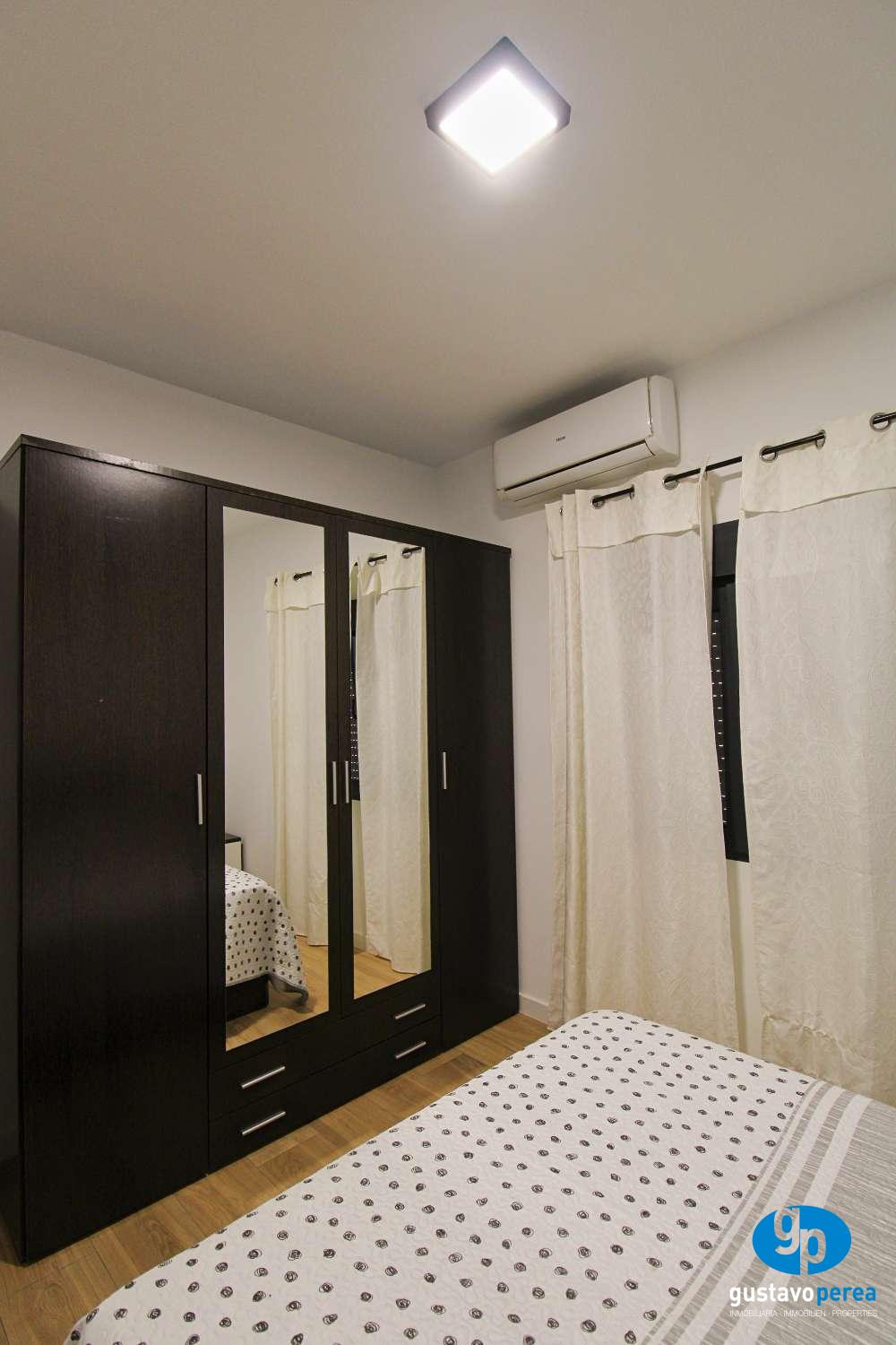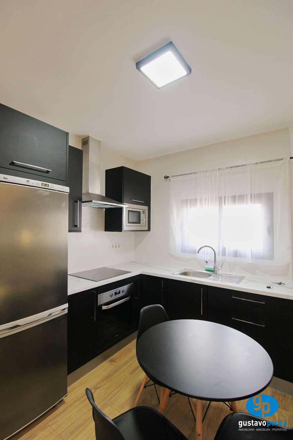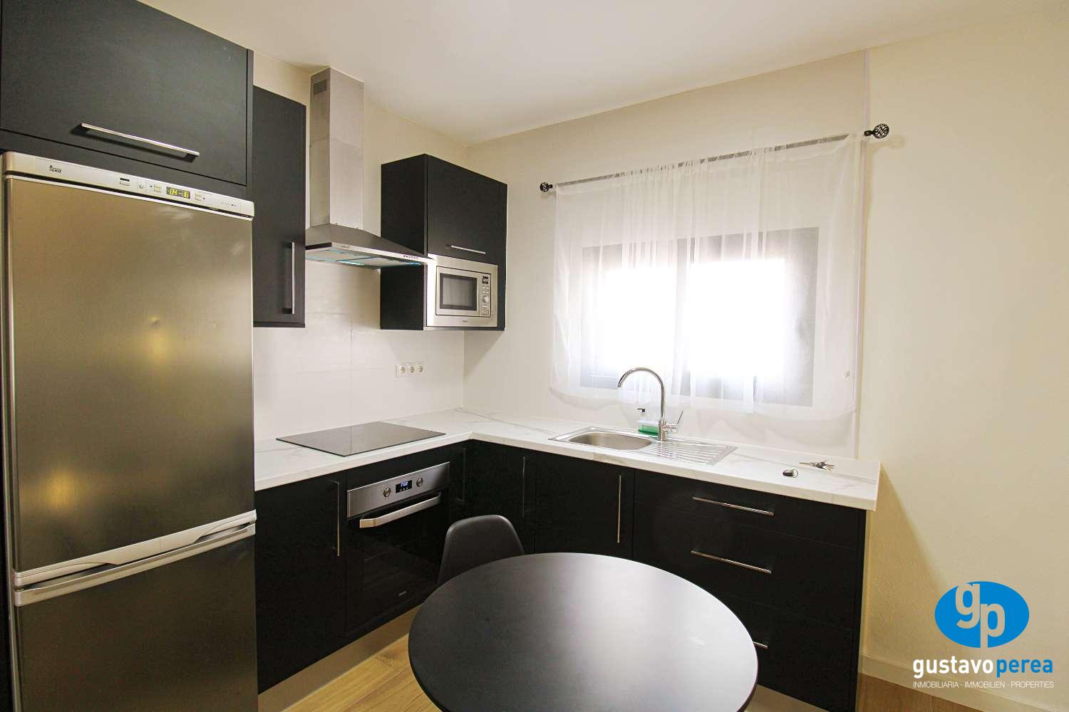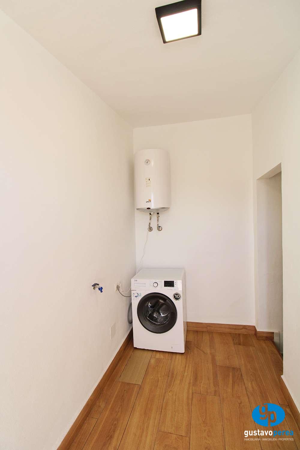 La vivienda cuenta con dos dormitorios, un baño completo, y un luminoso salón que conecta con una amplia terraza de 22 m², ideal para disfrutar del buen clima durante todo el año. La cocina está completamente amueblada y equipada, además dispone de lavadero independiente, lo que aporta mayor comodidad en el día a día.